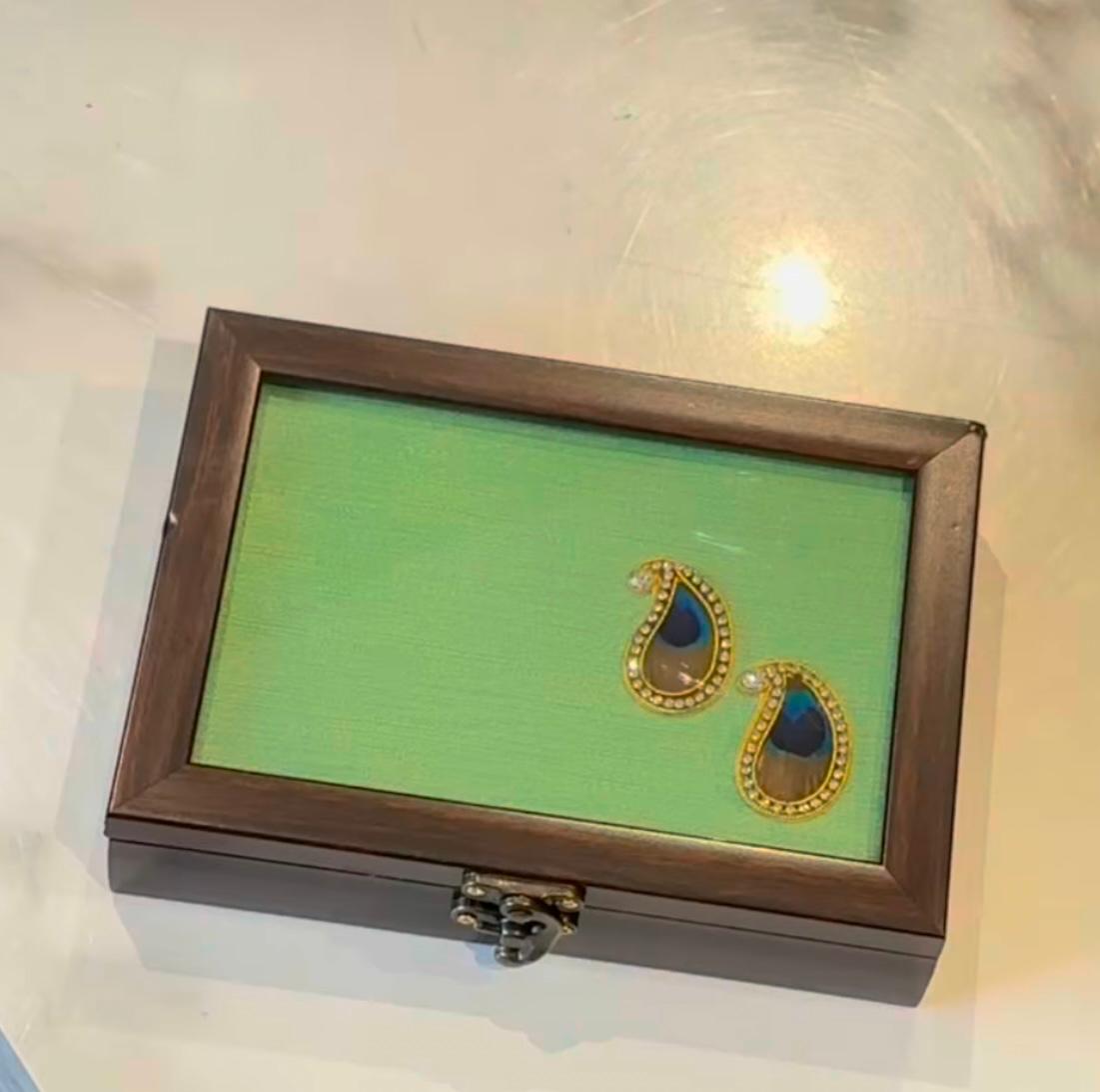 Showcase elegance with this paisley box—featuring a glass top and intricate teardrop-shaped earrings set against a rich green backdrop. Perfect for gifting or display, it blends regal charm with handcrafted finesse.